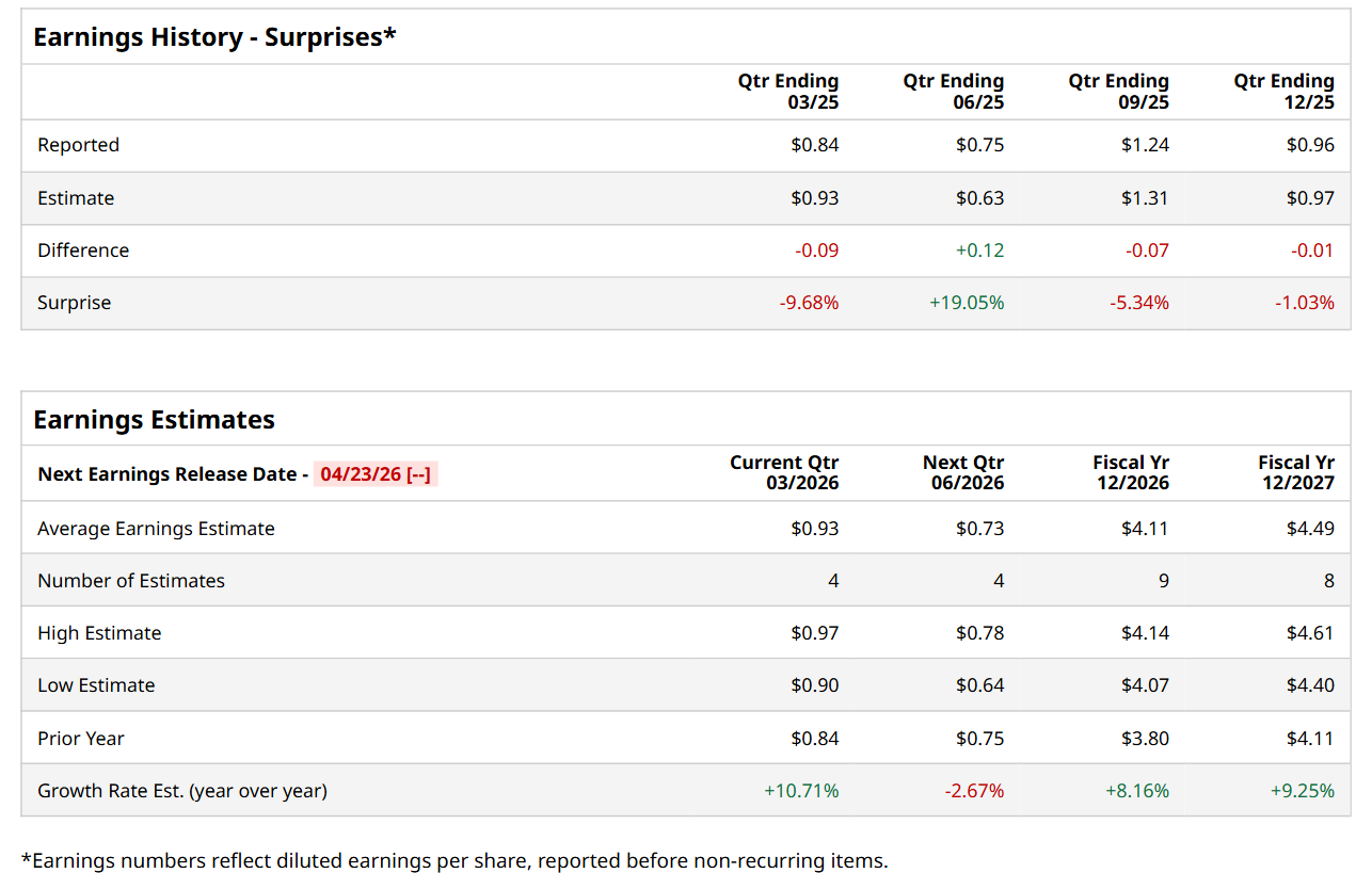 Ahead of this event, analysts expect this utility company to report a profit of $0.93 per share, up 10.7% from $0.84 per share in the year-ago quarter. The company has missed Wall Street’s earnings estimates in three of the last four quarters, while surpassing on another occasion. In Q4 2025, XEL’s EPS of $0.96 fell short of the consensus estimates by 1%.