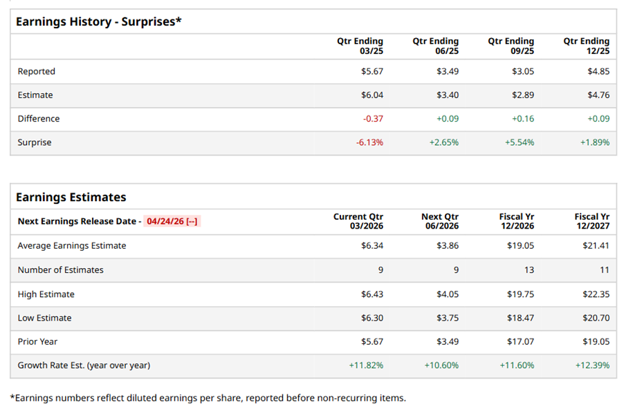 Aon plc (AON), headquartered in Dublin, Ireland, is a professional services firm that provides a range of risk and human capital solutions. With a market cap of $69.2 billion, the company's services include helping manage risk for clients, negotiating and placing insurance risk with other carriers, and advising clients related to health and benefits, retirement, compensation, strategic human capital, and human resource outsourcing. The leading professional services firm is expected to announce its fiscal first-quarter earnings for 2026 in the near term.