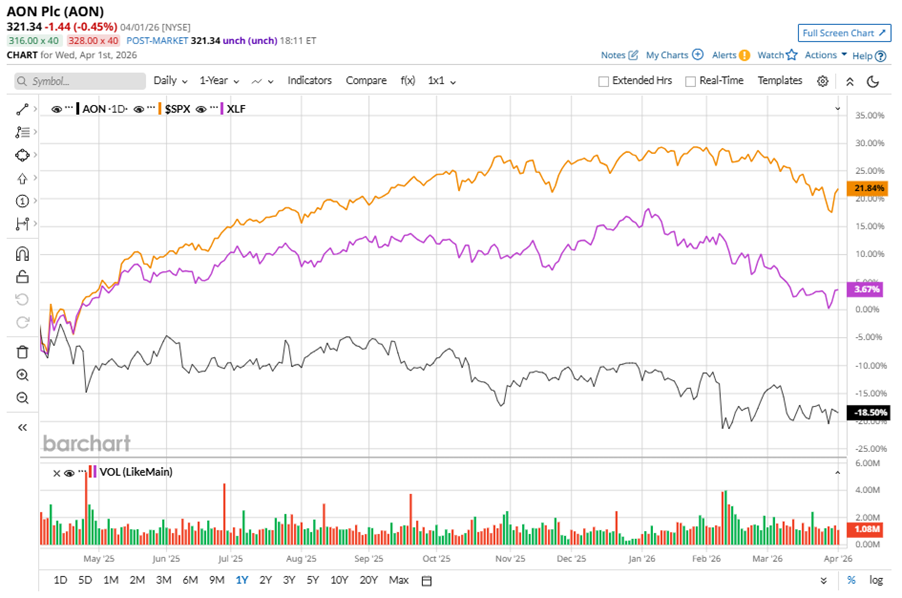 AON stock has significantly underperformed the S&P 500 Index’s ($SPX) 16.7% gains over the past 52 weeks, with shares down 19.4% during this period. Similarly, it considerably underperformed the State Street Financial Select Sector SPDR ETF’s (XLF) marginal dip over the same time frame.