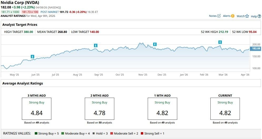 The consensus rating on Nvidia remains a “Strong Buy,” with the mean price target of about $269 indicating potential upside of nearly 50% from here.