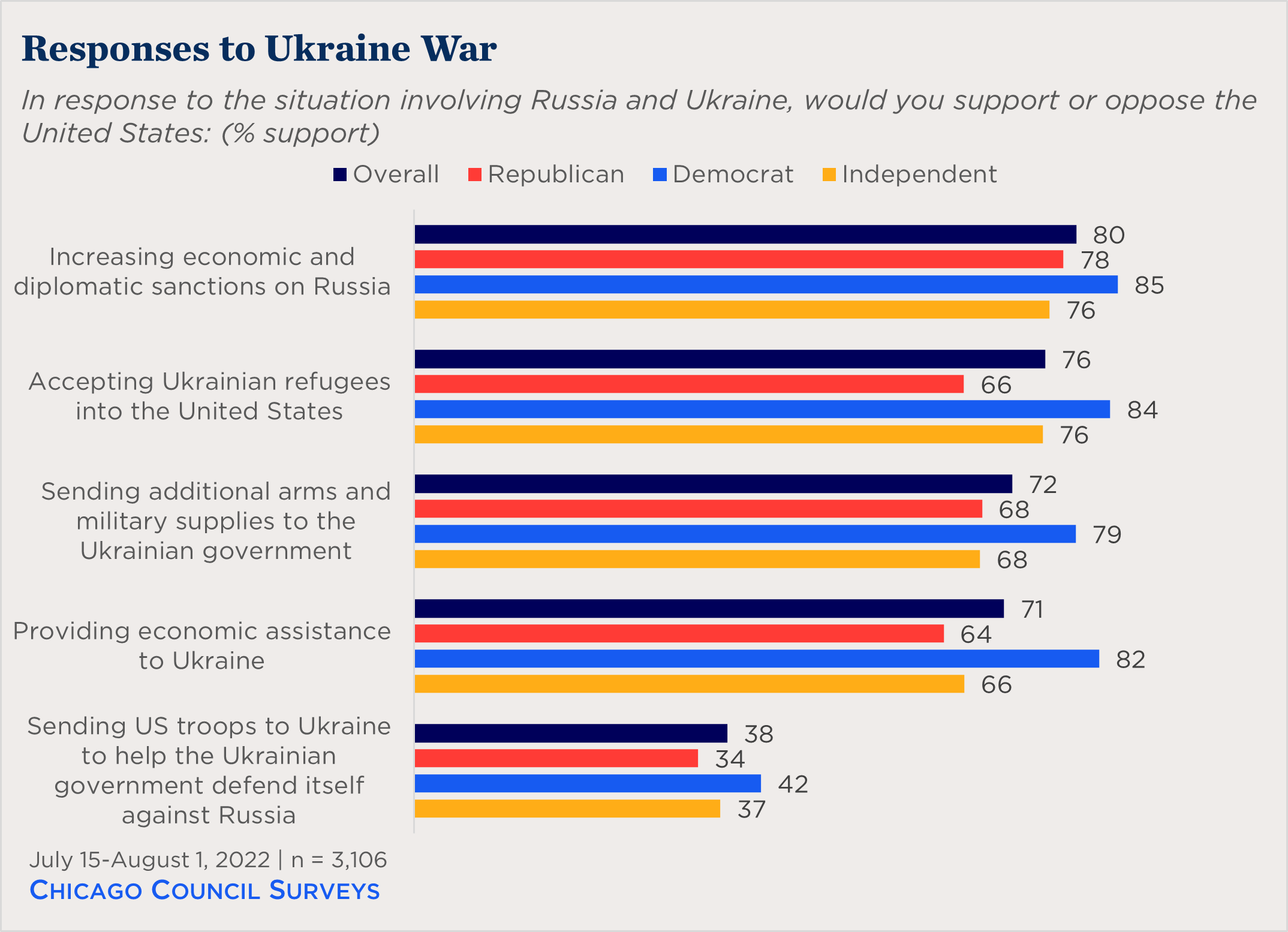 - Eighty-one percent of Americans say the United States should maintain (62%) or increase (19%) its commitment to NATO, the highest level of support recorded since Chicago Council Surveys began in 1974.