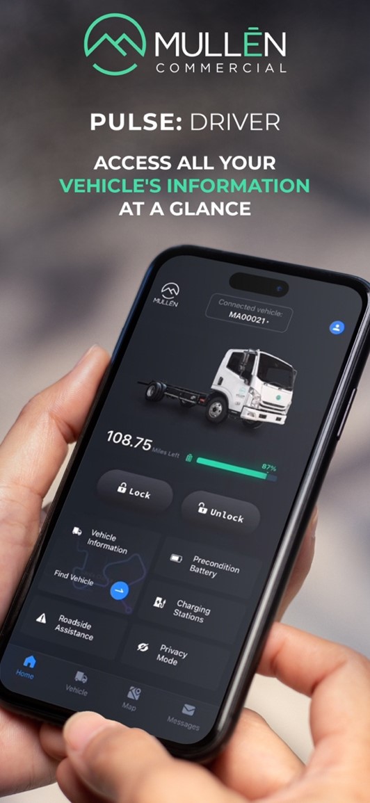 Commercial Pulse is available via two mobile applications – Mullen Commercial Pulse Fleet and Mullen Commercial Pulse Driver – on both iOS and Android platforms. Mullen Commercial Pulse Fleet provides insights and access, including a variety of management functions like vehicle health, maintenance, battery and safety/security alerts. Mullen Commercial Pulse Driver improves driver practice and time management with features like routing assistance, real-time vehicle location, charging station locator and roadside assistance.