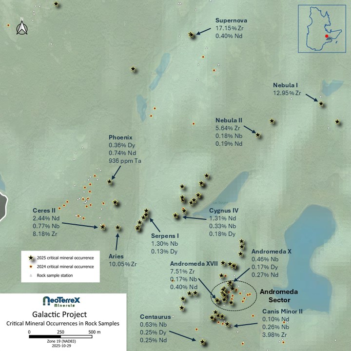 At the Galactic project, NeoTerrex completed a spring exploration program consisting of prospecting, mapping, and channel sampling. A total of 44 new mineralized occurrences were discovered, extending known mineralized zones and confirming the district-scale critical-metal potential of the project. The program also included channel sampling in locations where bedrock exposure was more prevalent. A table of the 2025 results and their coordinates is provided further below, adding to the 38 occurrences located last year (NeoTerrex December 6, 2024 news release). A map indicating the location of discoveries in relation to last year's results is also provided.