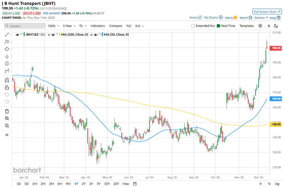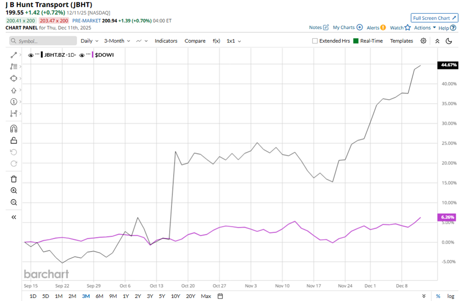 Shares of JBHT climbed 22.1% following its Q3 2025 results on Oct. 15. The company delivered stronger-than-expected revenue of $3.05 billion and EPS of $1.76. Investors responded positively to clear evidence of structural cost reductions and productivity improvements across key segments, including 12% operating income growth in Intermodal, 9% operating income growth in DCS, and a sharply narrowed loss in ICS.