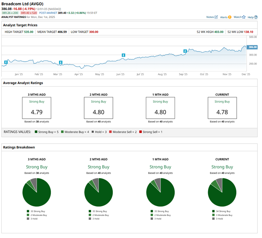 AVGO’s massive run has already carried it close to the Street’s average target of $410.78. That has some investors questioning how much near-term upside is left. Still, the most bullish target on Wall Street of $535 points to a possible 40% climb. That basically shows how much confidence there is in Broadcom’s growing role in the AI chip world and the steady demand for its custom silicon.