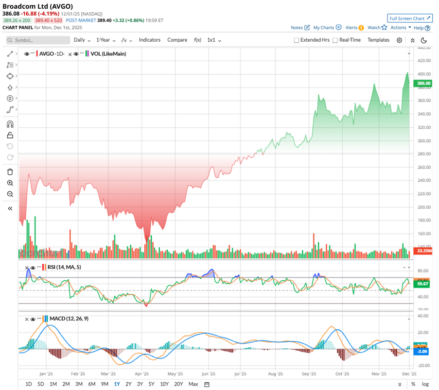 The backdrop is a roaring demand environment, and Broadcom is sprinting ahead of the pack. In just the past three months, the stock has ripped 15%, touching a fresh high of $403 recently. Momentum really kicked in after third-quarter earnings in September revealed a massive $10 billion custom-chip order, instantly lighting up trader enthusiasm.