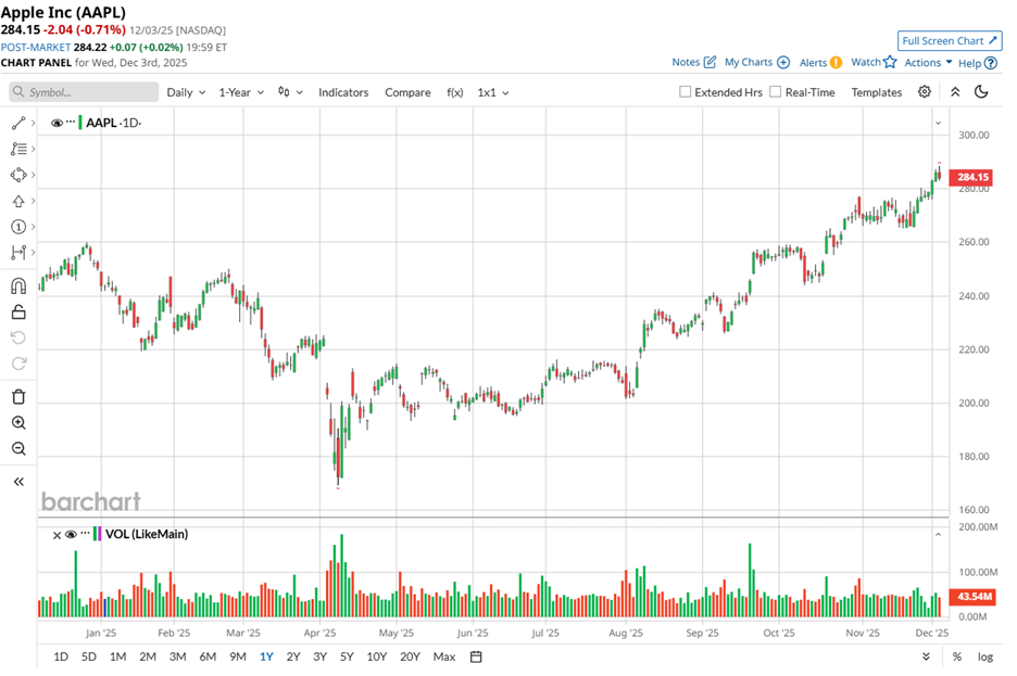 AAPL stock reflects this loyalty and momentum. Over the past 52 weeks, shares climbed 15.51%, while the past six months alone delivered a robust 38.4% rally. For comparison, the Roundhill Magnificent Seven ETF (MAGS) gained 24.94% over the past year and 27.16% in the past six months.