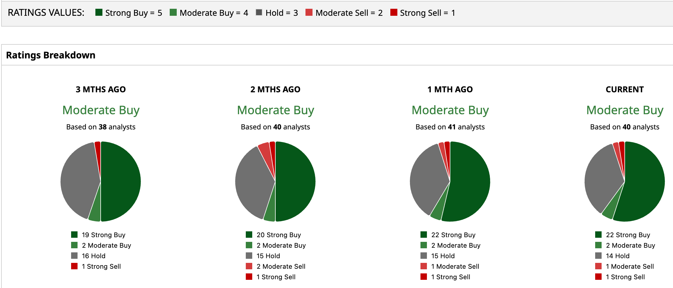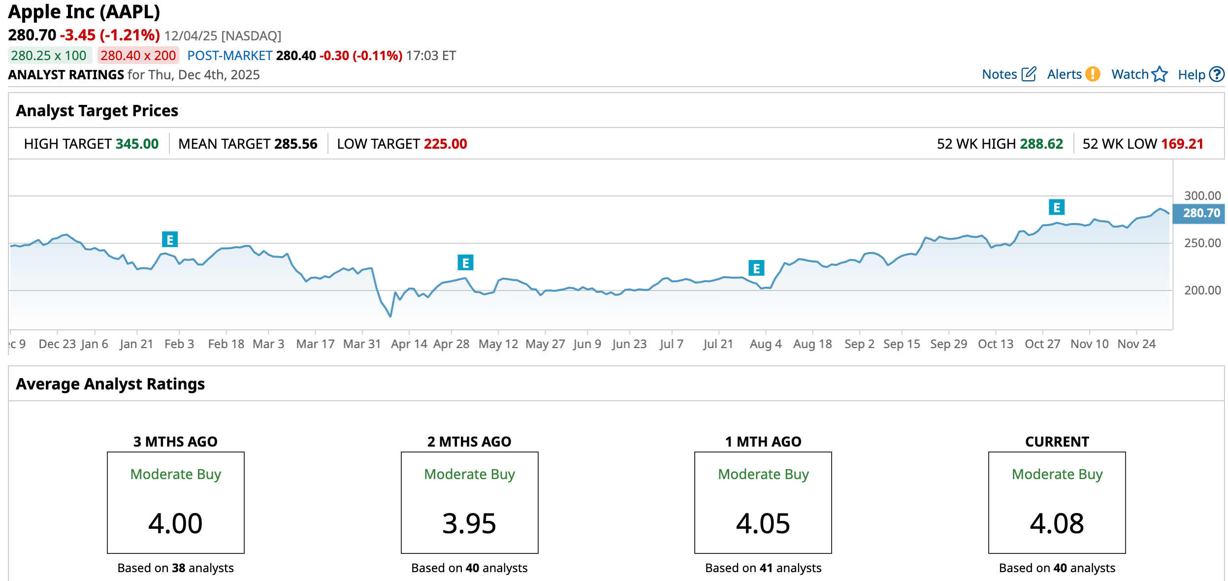 Across Wall Street, sentiment skews positive, with AAPL carrying a “Moderate Buy” consensus rating. Out of 40 analysts, 22 issue a “Strong Buy,” two recommend a “Moderate Buy,” 14 prefer “Hold,” one assigns a “Moderate Sell,” and one delivers a rare “Strong Sell.”