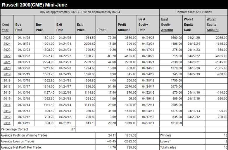 Hypothetical testing over the past 15 years has found that the June Russell 2000 futures have closed higher on April 24 than on April 13, with the trade lasting 12 calendar days in 13 of those years, for an 87% occurrence rate. The average index points profit was 14.70, or $735.00, based on one mini Russell 2000 contract.