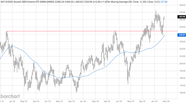 Currently, the Russell 2000 Index (IWM) is trading at 263.80, only 7.8 points from its all-time high of 271.60.