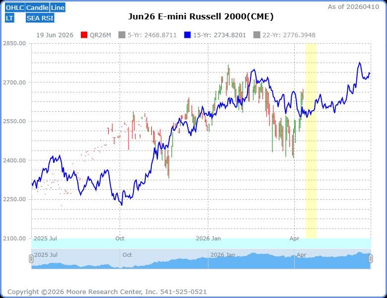 The recent April 2026 lows coincided with MRCI research showing that the 15-year average price cycle (blue line) had bottomed during that period. With extensive detailed research, MRCI has identified an optimal bullish seasonal window (yellow box). Previously, in the comments above, we discussed the significant inter-market correlation among the Russell 2000, the S&P 500, and the Dow Jones Industrial Average, allowing traders to use any of the three indexes to participate in this opportunity.