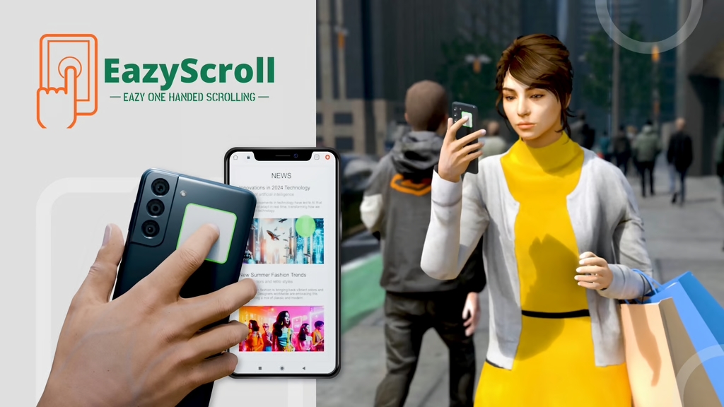 EazyScroll addresses the common challenges of smartphone use—hand strain from curled up thumbs and palms, awkward grips, and accessibility limitations. Its key features include: